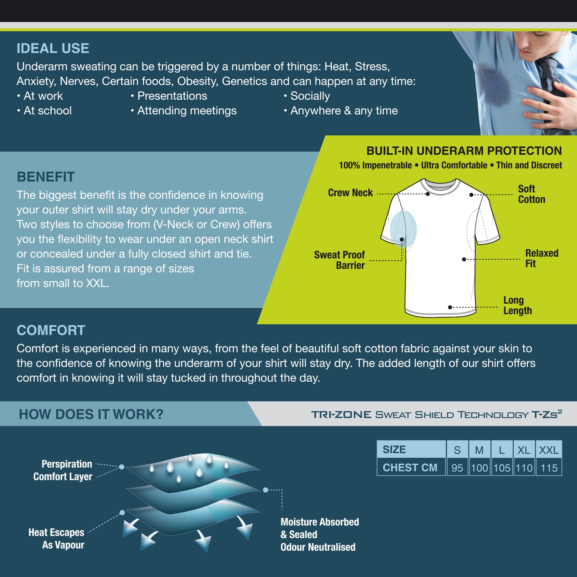 No Sweat Tee is an undershirt T-shirt designed to keep you dry and prevent underarm sweat marks. The ultra-thin built-in absorbent pad, absorb sweat and prevent it from getting through to your outer shirt, which in turn helps prolong the life and appearance, as well as ensuring your shirt stays looking crisp and fresh. The Crew neck offers the option to show/hide the garment under your shirt, depending upon the occasion.